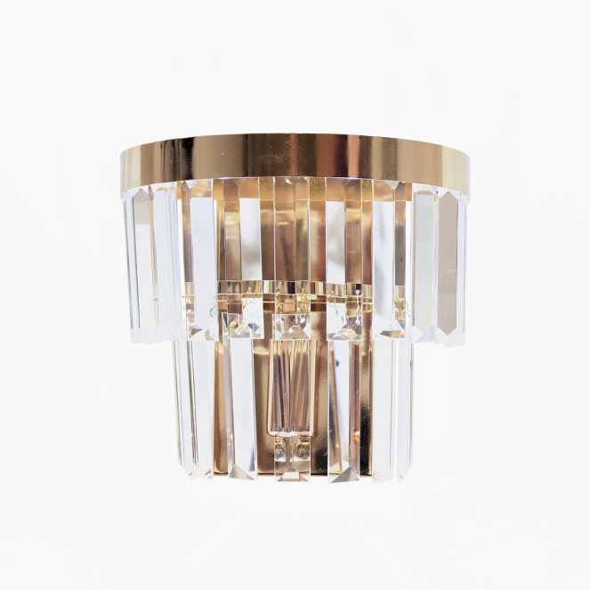 Apresentamos o aplique OLFUS, feito com barras de cristais transparentes e chapa dourada. As medidas deste modelo de aplique são de 22 cm de altura e 22 cm de diâmetro. Este modelo fica completo com 1 lâmpada E14 (não incluída).