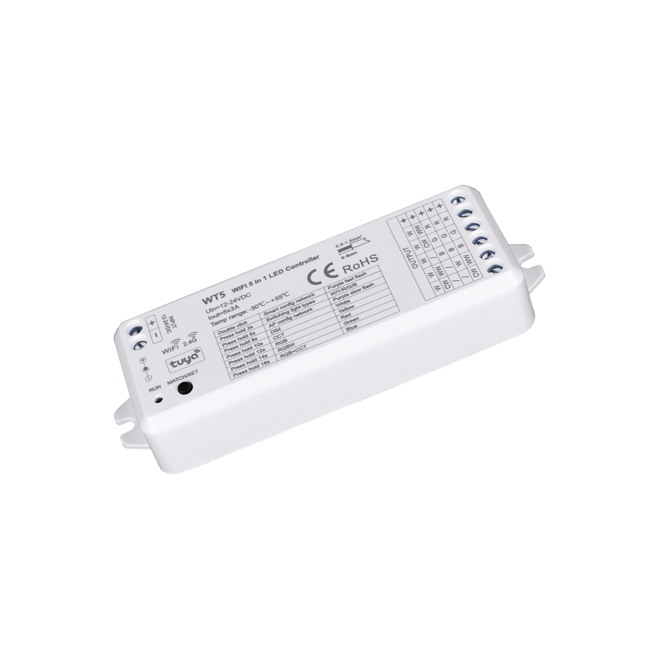 Controlador Wifi e RF 5 canais 3A/canal para fitas LED RGB/RGBW/RGB+CCT ou monocor 12/24Vdc