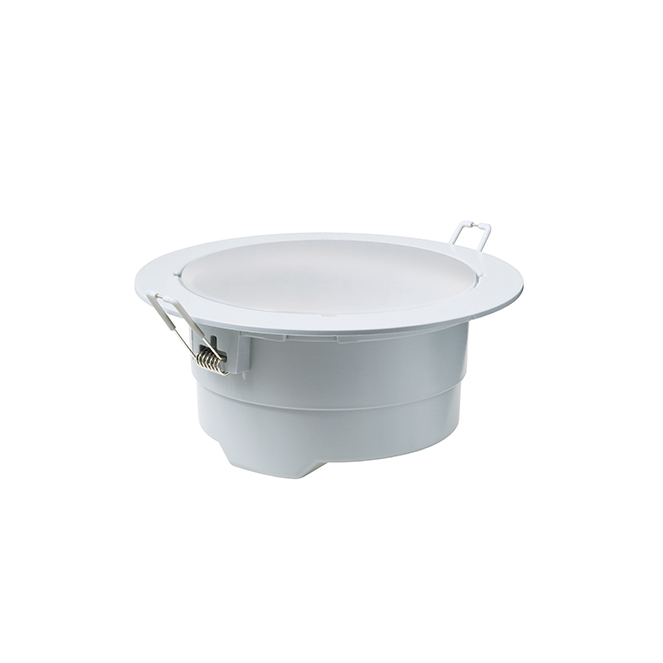 As medidas deste downlight de formato redondo são de 6,9 cm de largura, 16 cm de diâmetro, em resina branca e difusor opalino em PC (IP66).