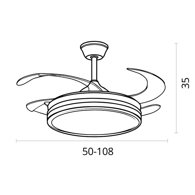Ventoinha de tecto DUNE com luz, 4 palas retráteis transparentes e motor DC com 6 velocidades.